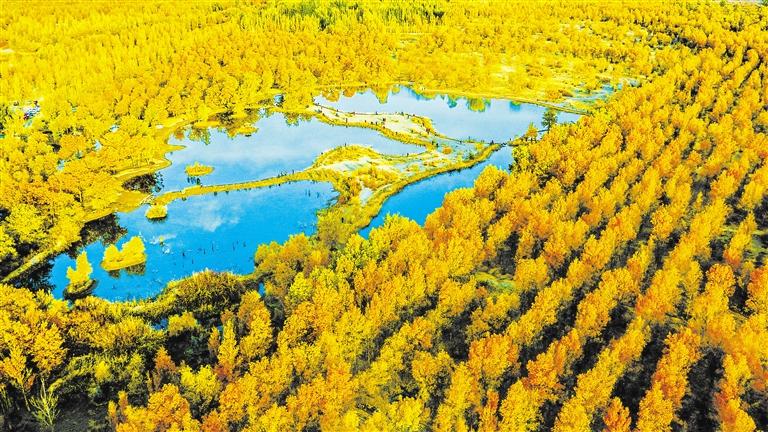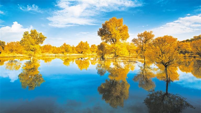 站在金波湖邊,滿目的赤橙黃綠與盈盈秋水互相映襯,胡楊金色的葉子倒映在潭水中,形成金色的水泊,微風(fēng)掠過,層層漣漪漸漸擴(kuò)大,最后消失在胡楊的倩影里,構(gòu)成一幅幅精美的油畫。烘托出一幅“碧云天、黃葉地、秋色連波、波上寒煙翠”的絕美妙油畫卷。