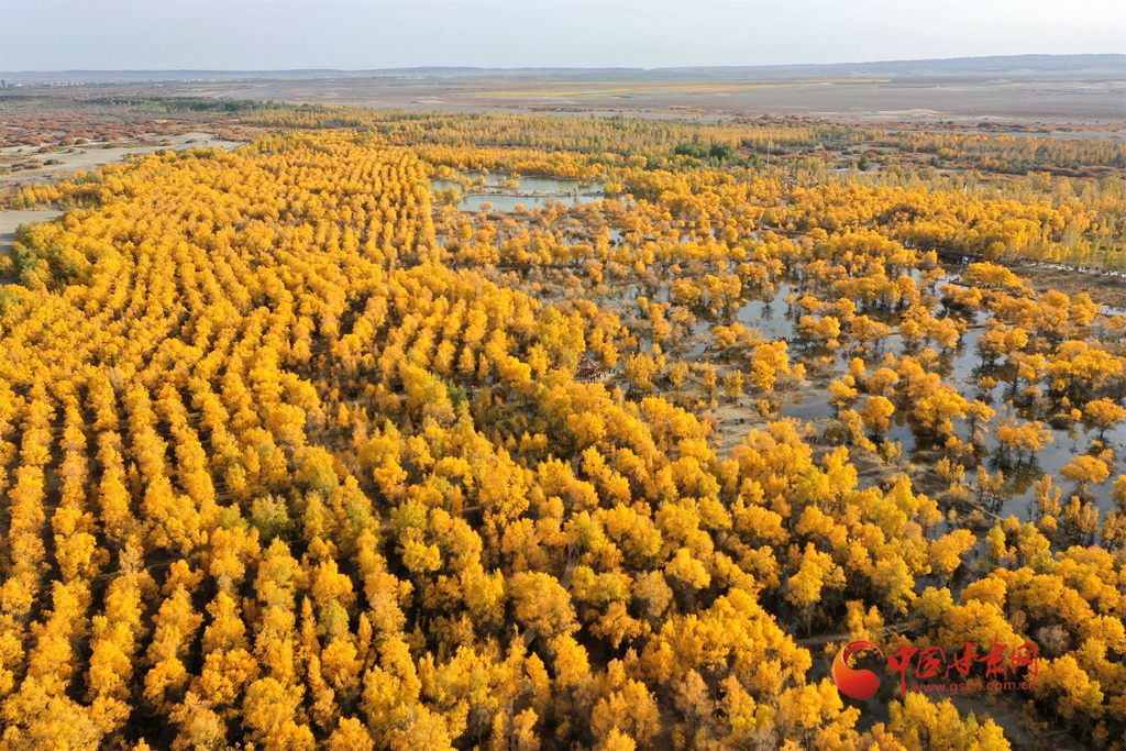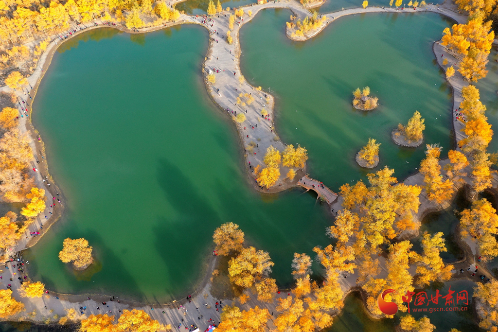 10月10日,在甘肅省酒泉市金塔沙漠胡楊林景區(qū),胡楊林在陽光的照耀下金黃燦爛,與湖水相映,令人流連忘返。(無人機照片)