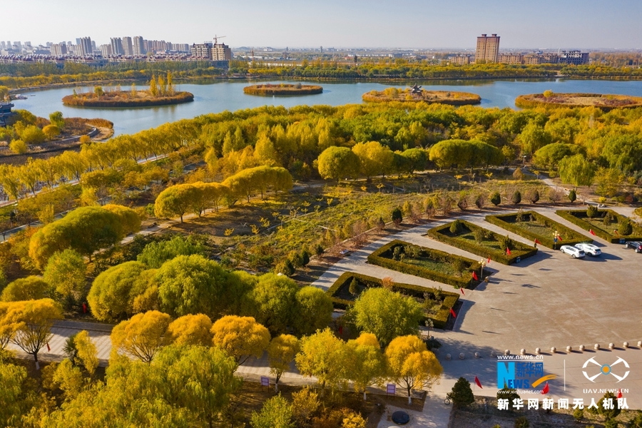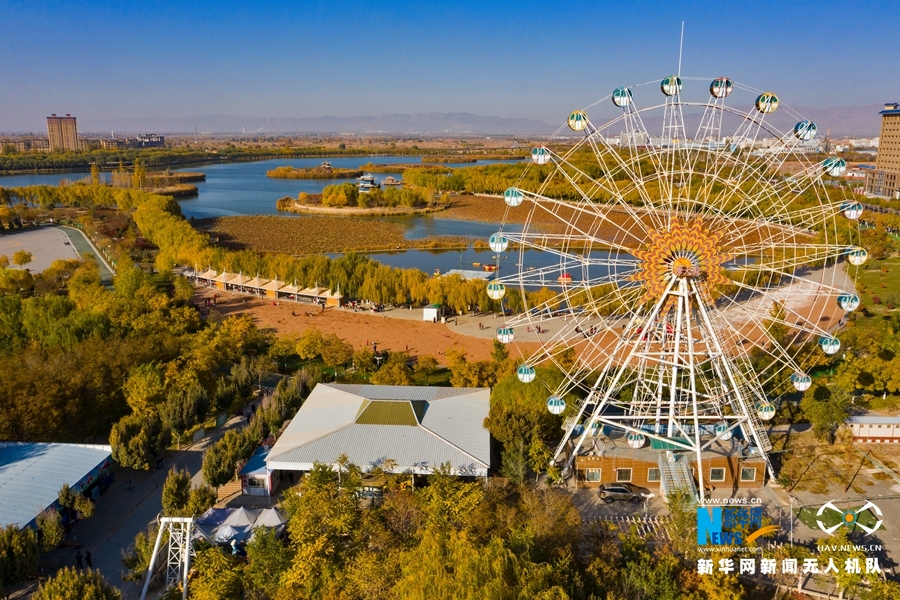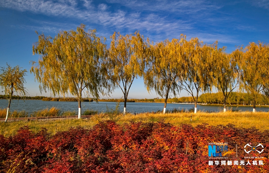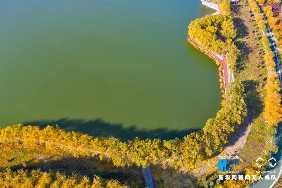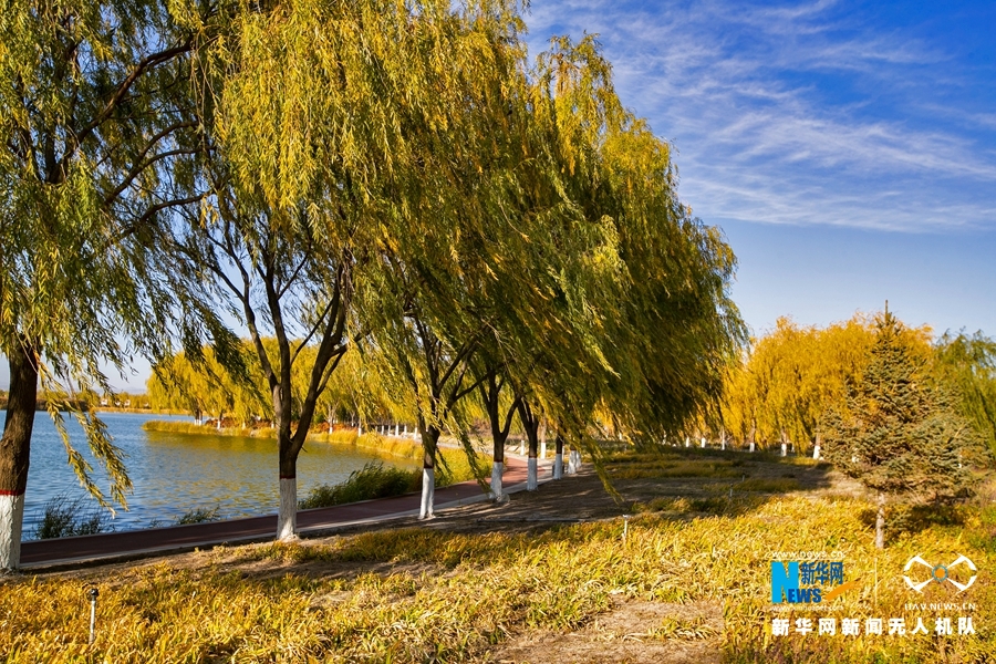 深秋時(shí)節(jié),國家4A級景區(qū)甘肅省張掖潤泉湖公園秋水依依,草木金黃,呈現(xiàn)出一幅斑斕畫卷。新華網(wǎng)發(fā)(成林 攝)