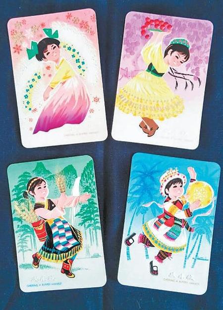 上世紀(jì)70年代,國(guó)家把進(jìn)出口公司產(chǎn)品當(dāng)作“拳頭”產(chǎn)品,為國(guó)家換取外匯。甘肅省也和其他省份一樣,作了積極的努力,省進(jìn)出口公司于1976年制作了四枚一套的《慶豐收》年歷片,以漢族、維吾爾族、藏族、壯族少女為圖案,表現(xiàn)了良好的藝術(shù)創(chuàng)作風(fēng)格。