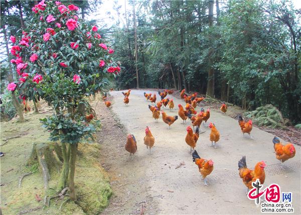 茶花具有“唯有山茶殊耐久,獨能深月占春風”的傲梅風骨,又有“花繁艷紅,深奪曉霞”的凌牡丹之鮮艷,因此自古以來就是極富盛名的木本花卉,在唐宋兩朝達到了登峰造極之境,直到十七世紀引入歐洲后,造成轟動,也因此獲得“世界名花”的美名。九龍街道牛街居委會小寨土雞生態(tài)產業(yè)園嬌艷的茶花給人一種神圣感,同時被賦予了一種原始的信仰:山茶是春天的神木,是春天的圣樹。置身九龍小寨土雞生態(tài)產業(yè)園,來一場與森林的浪漫邂逅,恍如仙境。園里有枇杷林、櫻桃林、楊梅林、梨樹林、紅豆杉林、柏樹林、椿樹林、油桃林、核桃林、灌木林以及草莓園、蔬菜園、山茶花園、荷花園,樹下是一群群羽毛鮮亮的土雞悠閑地覓食,好一幅田園風景畫!
