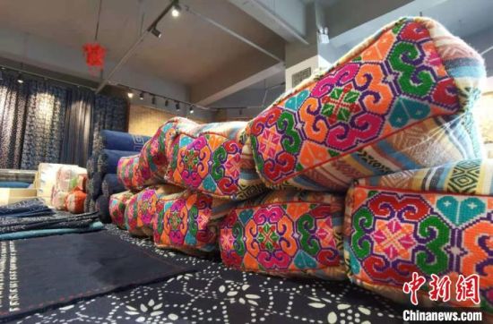 近日,中新網(wǎng)記者在安定區(qū)一家非遺工坊內(nèi)見到祁輝,她身著正紅色漢服,腰間掛著香囊,穿梭于服飾區(qū)、布偶區(qū)和染布區(qū)之間。記者看到,工坊內(nèi)展出商品種類多樣,色彩豐富,包括潮流挎包、時(shí)尚發(fā)卡、卡通布偶、可愛抱枕,以及扎染服裝和圍巾等,在極具古風(fēng)創(chuàng)意的同時(shí),還不乏國(guó)潮設(shè)計(jì)理念。