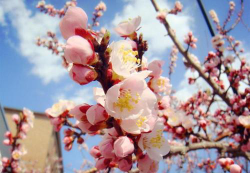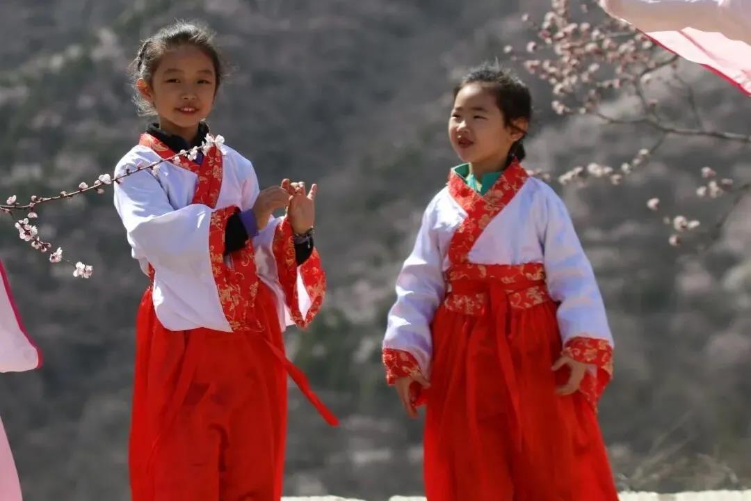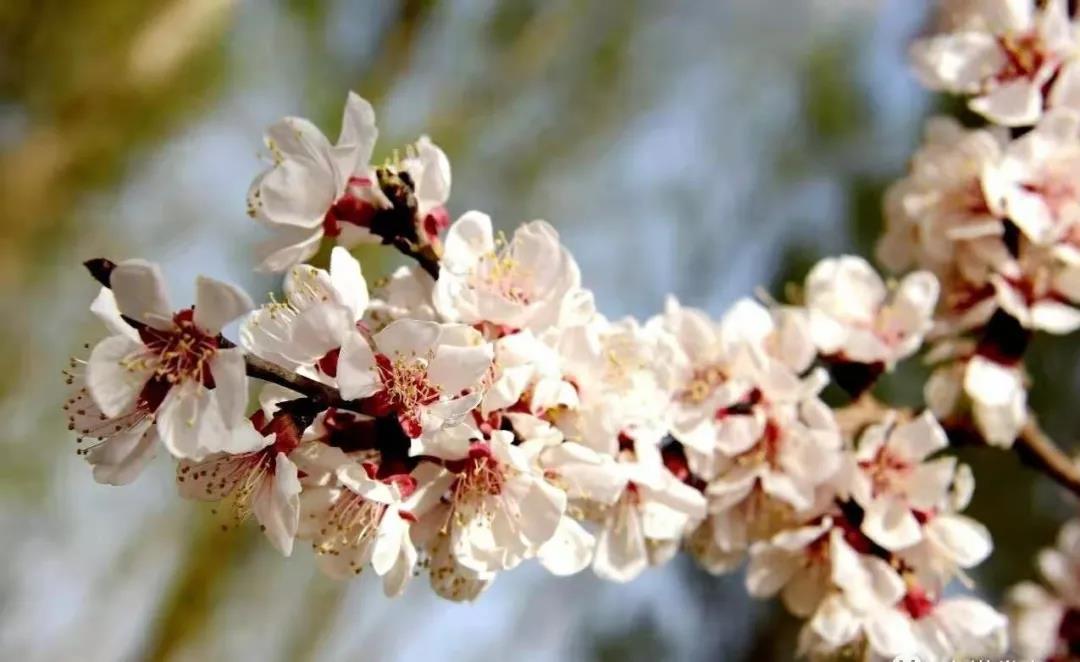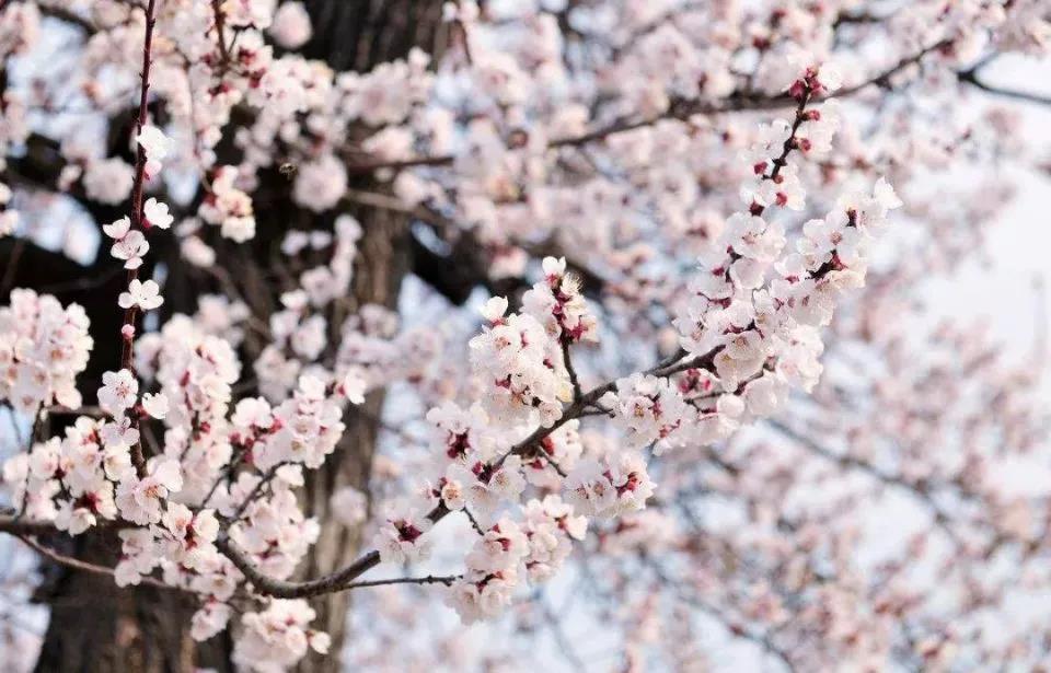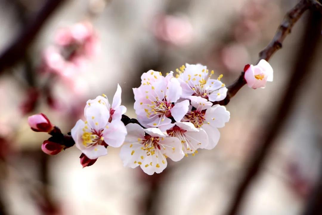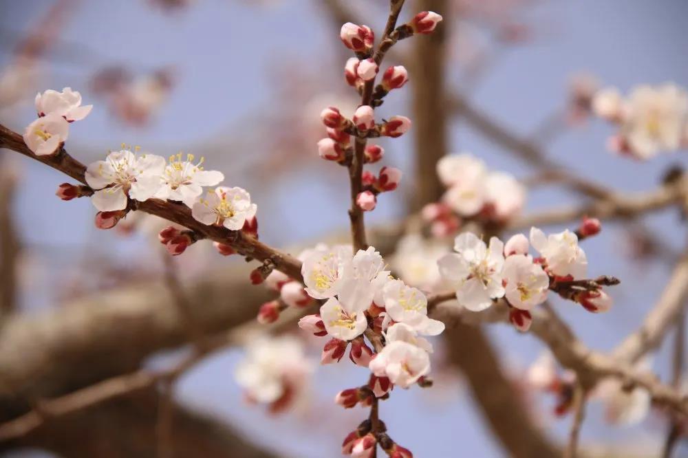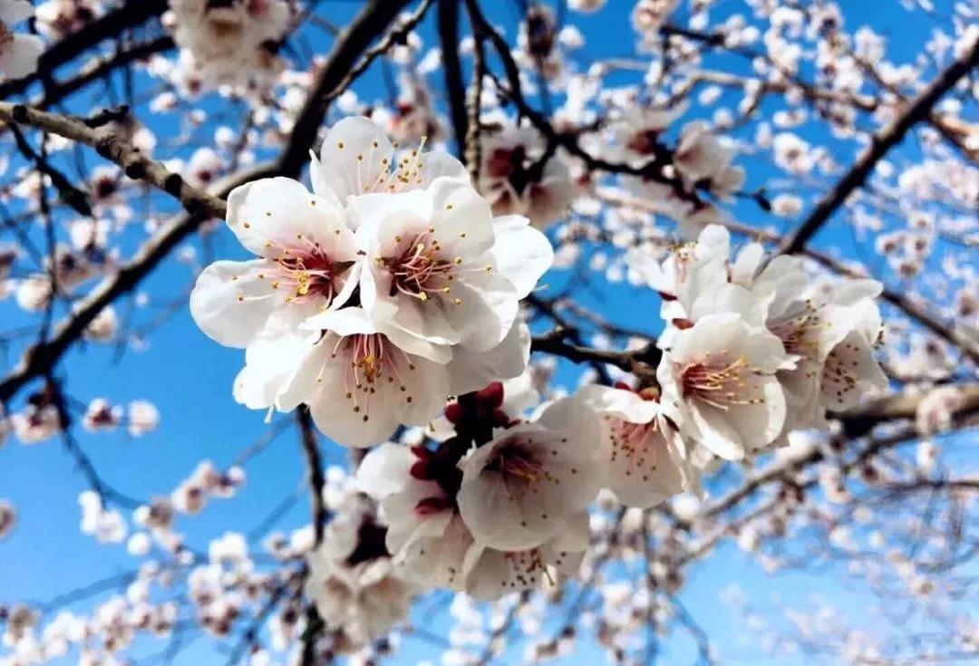沐浴在明媚春光下,紅的、粉的、白的……競相綻放,遠遠望去,一幅十里杏花畫卷徐徐展開。