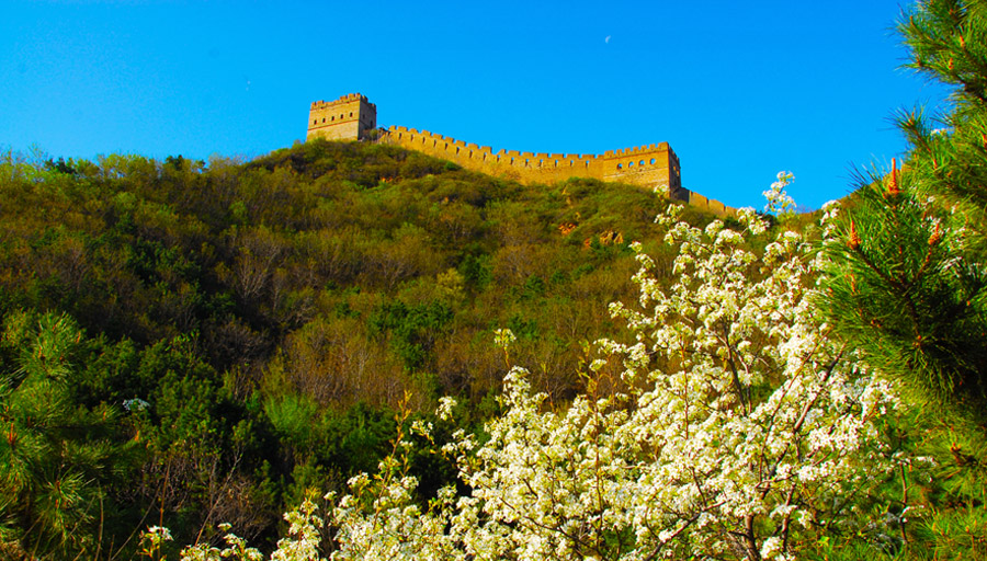 這個(gè)季節(jié),金山嶺長(zhǎng)城被各種鮮花層層包裹,杏花、映山紅、山桃花等,沿著長(zhǎng)城盛放,沿臺(tái)階而上,亦變成步步花階,十里畫(huà)廊。