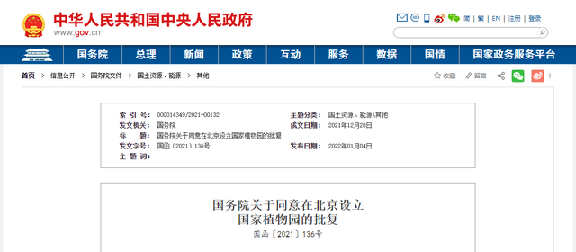 2021年12月28日,國(guó)務(wù)院公開(kāi)發(fā)布《關(guān)于同意在北京設(shè)立國(guó)家植物園的批復(fù)》(以下簡(jiǎn)稱《批復(fù)》)。《批復(fù)》稱,國(guó)務(wù)院已同意在北京設(shè)立國(guó)家植物園,由國(guó)家林草局、住房城鄉(xiāng)建設(shè)部、中科院、北京市人民政府合作共建。