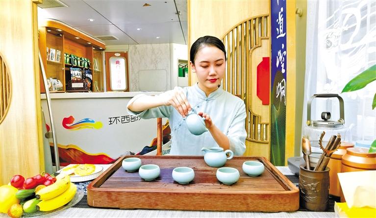 這趟列車由6節(jié)軟臥車廂、1節(jié)餐車、1節(jié)休閑娛樂功能車組成,車體內(nèi)外隨處可見平?jīng)鑫幕糜卧?。記者在車廂?nèi)看到,崇信龍泉寺、華亭安口窯古村落、靜寧仙人峽……每一間軟臥門上都是絕美的平?jīng)鲲L(fēng)光大片,整個(gè)車體儼然移動(dòng)的“平?jīng)鑫穆谜桂^”,讓人“身未動(dòng),心已遠(yuǎn)”。車體中部的功能車,更是顛覆了以往人們對(duì)火車的認(rèn)知,麻將桌、功夫茶、全套的K歌設(shè)備,還有平?jīng)鎏厣穆蒙唐?、農(nóng)特產(chǎn)品展銷區(qū),平?jīng)鑫穆脮営[區(qū)、平?jīng)鑫幕黝}報(bào)刊欄,足以打發(fā)游客在旅途中的無(wú)聊時(shí)光。餐車也極富特色,車廂頂部裝飾有色彩豐富的藻井圖案,飛天仙子衣袂飄飄、環(huán)繞四周。“在這樣的餐車上吃飯,吃的那是品位。”一位乘客開心地和同行的伙伴說(shuō)著。62歲的張女士一到平?jīng)鼍兔Σ坏亟o女兒發(fā)微信,“火車上住得舒適,服務(wù)好,環(huán)西部火車游·崆峒號(hào)很超值!”