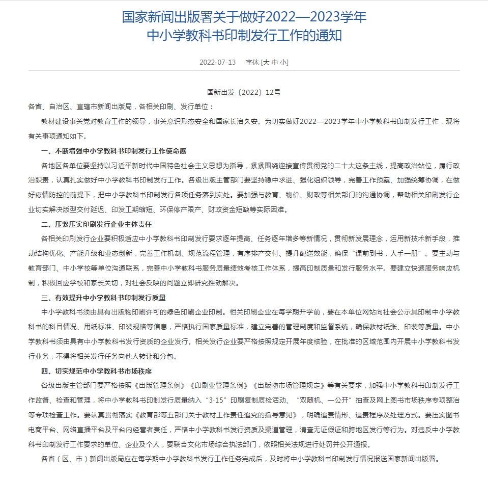 針對(duì)中小學(xué)教科書印制發(fā)行等環(huán)節(jié),《通知》中表示要有效提升中小學(xué)教科書印制發(fā)行質(zhì)量。