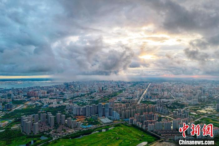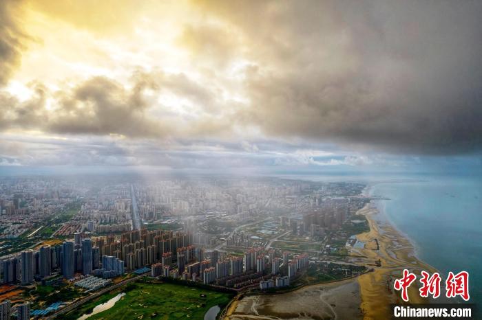 圖為陽光穿過云層照耀北海市城區(qū)?!⌒旖B榮 攝