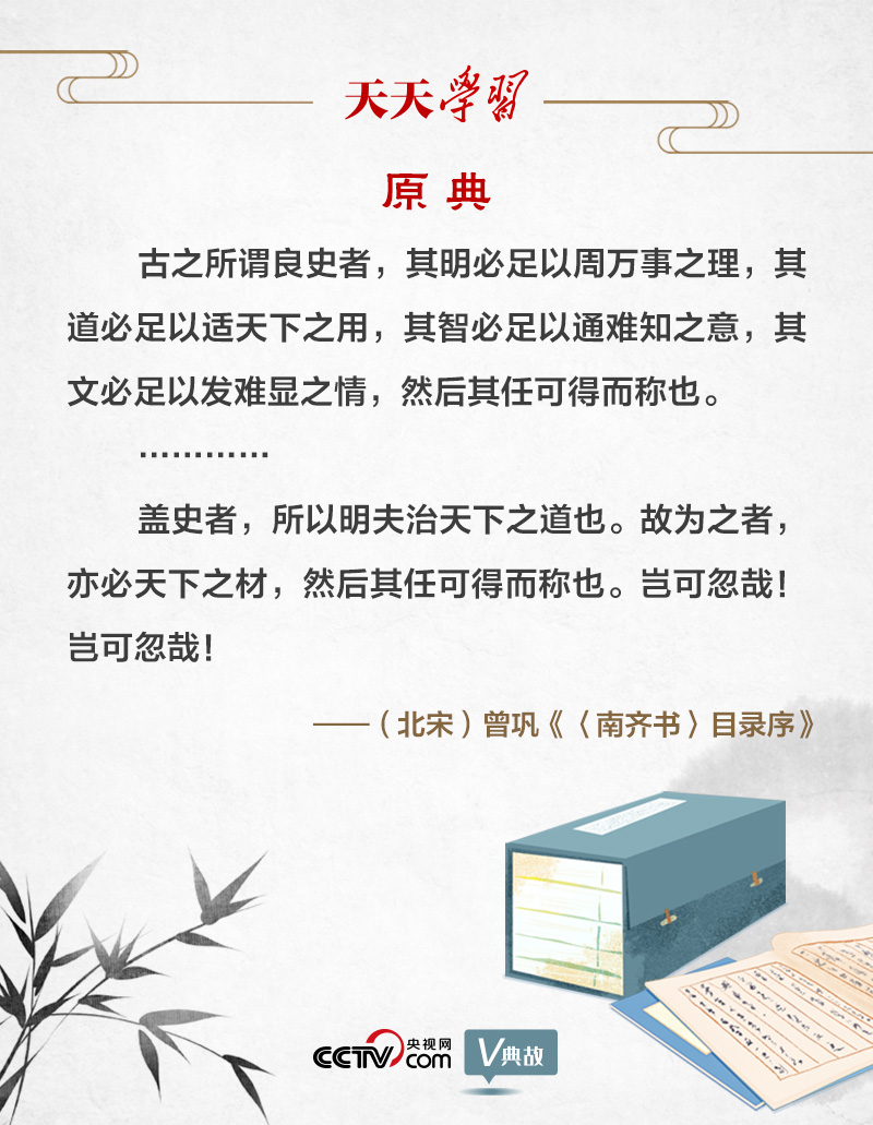 《〈南齊書〉目錄序》是曾鞏為“二十四史”之一的《南齊書》所寫的一篇序文,體現(xiàn)了曾鞏的史學研究價值取向。文章圍繞著“良史(優(yōu)秀的史官)”二字展開。曾鞏認為,“古之所謂良史者,其明必足以周萬事之理,其道必足以適天下之用,其智必足以通難知之意,其文必足以發(fā)難顯之情”。曾鞏在唐代史學家劉知幾“史才三長(才、學、識)”基礎上,將“良史”的標準引申為四點:明、道、智、文。其中,文、明、智相當于才、學、識,而“道”則是曾鞏的發(fā)展,并被擺在核心位置。曾鞏指出,“蓋史者,所以明夫治天下之道也。故為之者,亦必天下之材”。曾鞏認為,史書要闡明治國安邦的法則和規(guī)律,因此史家必須是兼具明、道、智、文的“天下之材”。他提出史家要發(fā)揮史學經(jīng)世致用的作用,修史要總結前朝興亡的經(jīng)驗教訓,為后世提供“法戒”。