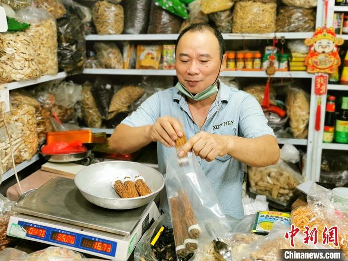 資料圖為廣東臺(tái)山富城市場內(nèi),一藥材檔的老板為顧客用密實(shí)袋打包參絲。 中新社發(fā) 李曉春 攝