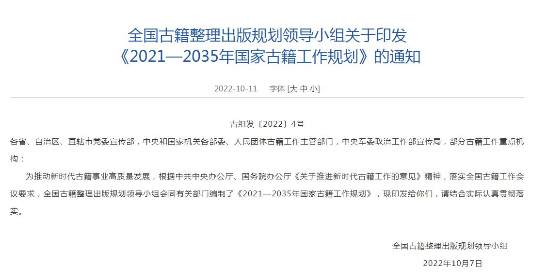 12日,據(jù)國(guó)家新聞出版署網(wǎng)站消息,全國(guó)古籍整理出版規(guī)劃領(lǐng)導(dǎo)小組會(huì)同有關(guān)部門編制了《2021—2035年國(guó)家古籍工作規(guī)劃》,其中提到,至2035年,古籍工作體制機(jī)制更加完善,以重大工程為引領(lǐng),加強(qiáng)古籍工作全局性謀劃,重點(diǎn)實(shí)施 《永樂(lè)大典》、敦煌文獻(xiàn)系統(tǒng)性保護(hù)整理出版工程等。