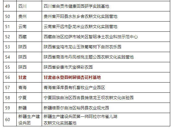 日前,農(nóng)業(yè)農(nóng)村部、共青團(tuán)中央、全國(guó)少工委組織開展了農(nóng)耕文化實(shí)踐營(yíng)地推薦工作。經(jīng)過逐級(jí)推薦、材料審查、專家評(píng)審和網(wǎng)上公示,全國(guó)農(nóng)業(yè)展覽館(中國(guó)農(nóng)業(yè)博物館)等60個(gè)單位為農(nóng)耕文化實(shí)踐營(yíng)地,甘肅省永登縣樹屏鎮(zhèn)杏花村基地入選。