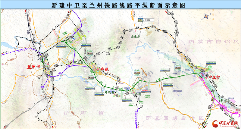 銀蘭高鐵中蘭段(甘肅段)正線全長173.727km,雙線,設計速度為250公里/小時,總投資255.51億元,工期5年。全線特大橋42座、大橋38座、中橋9座、涵洞256座、隧道15座。2016年11月14日,國家發(fā)改委批復新建中衛(wèi)至蘭州鐵路可行性的研究報告。