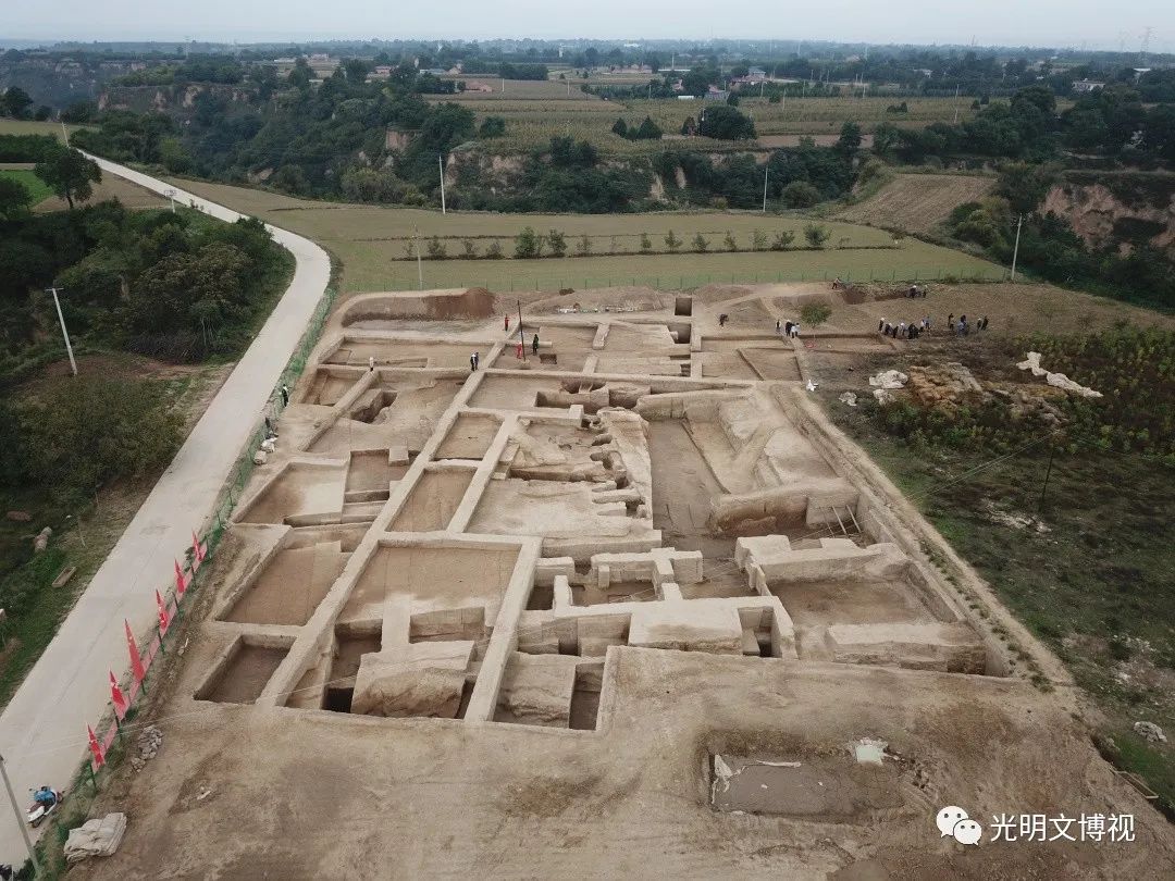 甘肅慶陽(yáng)西峰西郊的南佐遺址,坐落在黃土高原第一大塬——董志塬上,傳說(shuō)中這里是黃帝部族的重要活動(dòng)地域,也是以農(nóng)業(yè)著稱(chēng)的周人祖先不窋?shù)睦霞?。南佐遺址發(fā)現(xiàn)于1958年,1984—1986年和1994—1996年有過(guò)兩個(gè)階段的發(fā)掘,從2021年開(kāi)始第三階段的發(fā)掘和調(diào)查、勘探工作,基本確認(rèn)這是一處以仰韶文化晚期大型聚落為主體的遺址,遺址面積在600萬(wàn)平方米以上,可能有外環(huán)壕。聚落中部是由9座方形夯土臺(tái)及其環(huán)壕圍成的面積約30萬(wàn)平方米的核心區(qū),核心區(qū)中部偏北是數(shù)千平方米的由“護(hù)城河”和夯土宮墻圍成的“宮城”。“宮城”中心為主殿,“九臺(tái)”之外還有多處居住區(qū)、夯土臺(tái)、溝渠水利設(shè)施等遺存,出土了大量白陶、黑陶等珍貴遺物和大量水稻,從多個(gè)方面顯現(xiàn)出早期國(guó)家和文明社會(huì)的氣象。
