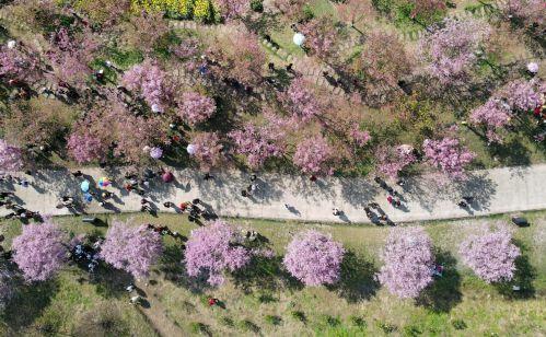 這是3月8日拍攝的都江堰市青城山鎮(zhèn)“問花村”櫻花大道一角(無(wú)人機(jī)照片)
