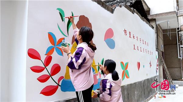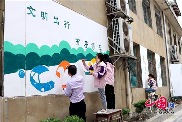 現(xiàn)場,大家手持畫筆和顏料板,相互分工協(xié)作,以墻為紙,認真細致的設計墻繪內(nèi)容,筆起筆落間,一幅幅栩栩如生、色彩絢麗的城市文明新畫卷躍然墻上。