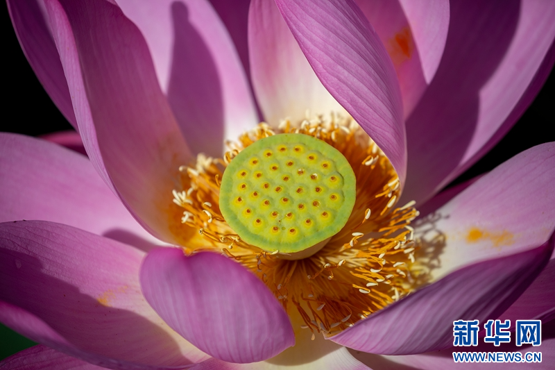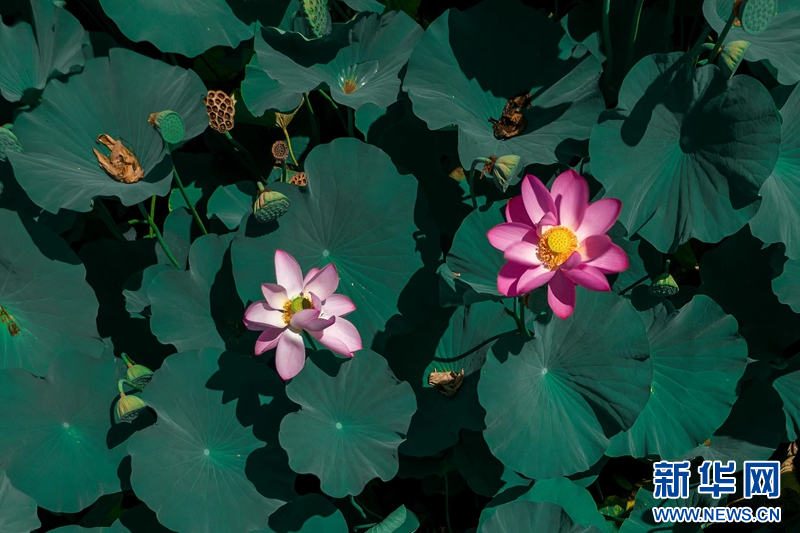 近日,在甘肅省白銀市白銀區(qū)水川黃河濕地公園,滿池荷花嬌艷、荷葉青翠,藍天、碧水、嬌花、翠葉構成了一幅秋日美景圖。新華網(wǎng)發(fā)(郭宏 攝)
