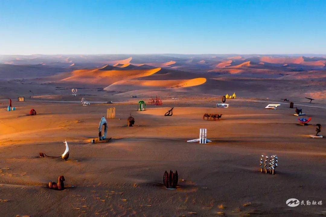 民勤蘇武沙漠景區(qū)絕對(duì)是網(wǎng)紅般的存在。刷屏各平臺(tái)它已成為常客,沙漠雕塑國(guó)際創(chuàng)作營(yíng)是大家最愛的拍照打卡地,132座不同材質(zhì)、不同風(fēng)格的藝術(shù)佳作,如一顆顆璀璨明珠飄落瀚海,與藍(lán)天白云、金色大漠完美融合、相映成趣,超級(jí)出片。