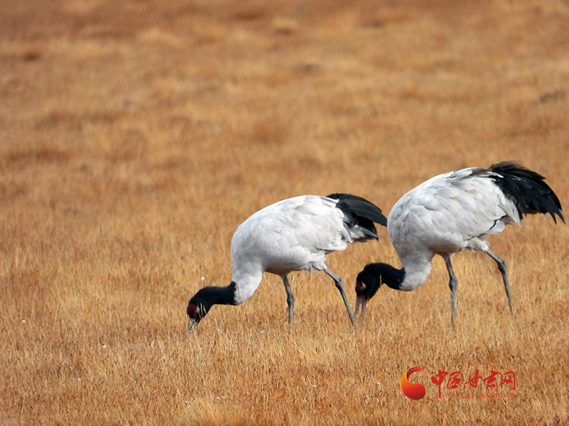 中國(guó)甘肅網(wǎng)10月17日訊 (西北角·中國(guó)甘肅網(wǎng)記者 張慧雅)近日,甘肅祁連山國(guó)家級(jí)自然保護(hù)區(qū)工作人員在轄區(qū)巡護(hù)時(shí)偶遇國(guó)家一級(jí)保護(hù)野生動(dòng)物黑頸鶴歇息覓食的場(chǎng)景,兩只黑頸鶴漫步在一處濕地中一邊欣賞美景一邊享用美食。