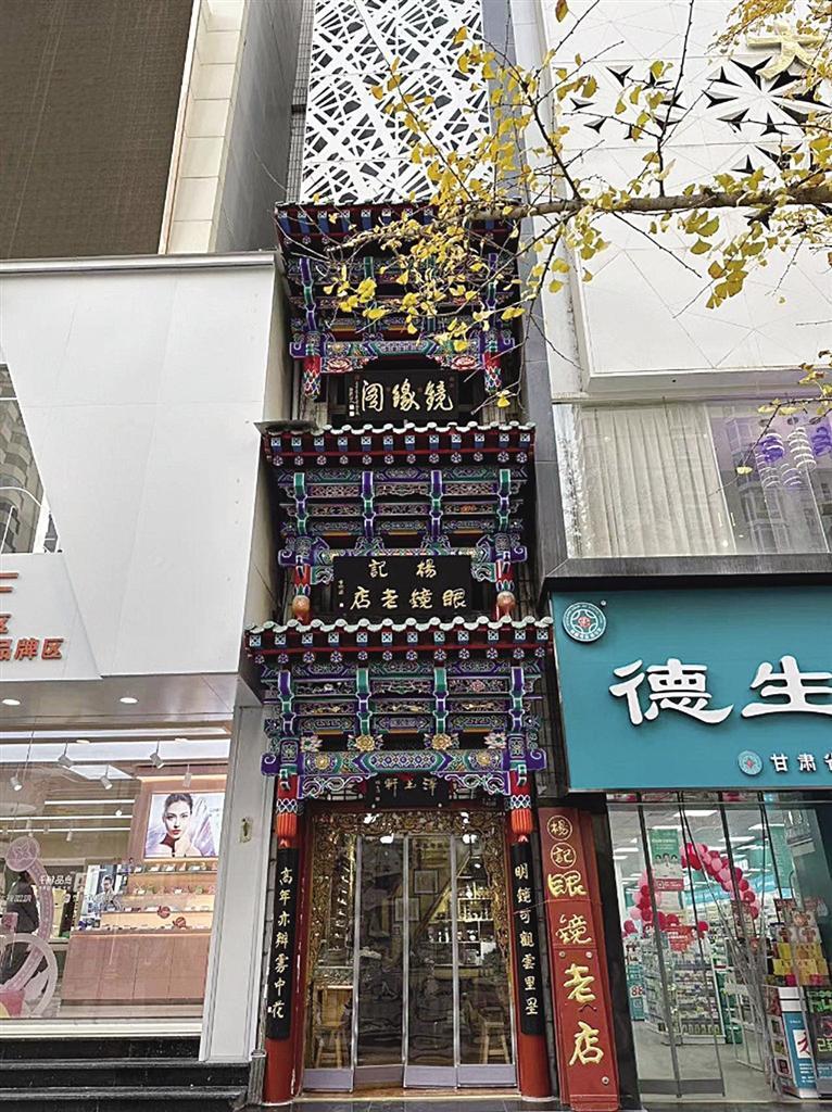 榫卯鑲嵌、手工木雕、精致彩繪、金箔貼邊,在張掖路步行街上,楊記眼鏡行的門樓招牌格外亮眼,雖然只有三四米寬的窄小門面,但店外從上而下的三塊古韻招牌彰顯出這家店的“不簡單”。“最下面這塊‘澤玉軒’的招牌是我家祖輩楊澤玉開創(chuàng)這家眼鏡行時(shí)留下的字號(hào)”,楊記眼鏡行是蘭州一家老字號(hào)的石頭眼鏡售賣和維修小店,光是制作修理石頭眼鏡這項(xiàng)手藝就已經(jīng)傳到了第五代,其店鋪在二十世紀(jì)八九十年代就獲得過商務(wù)部的“中華老字號(hào)”認(rèn)可。