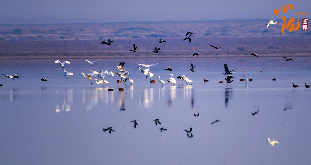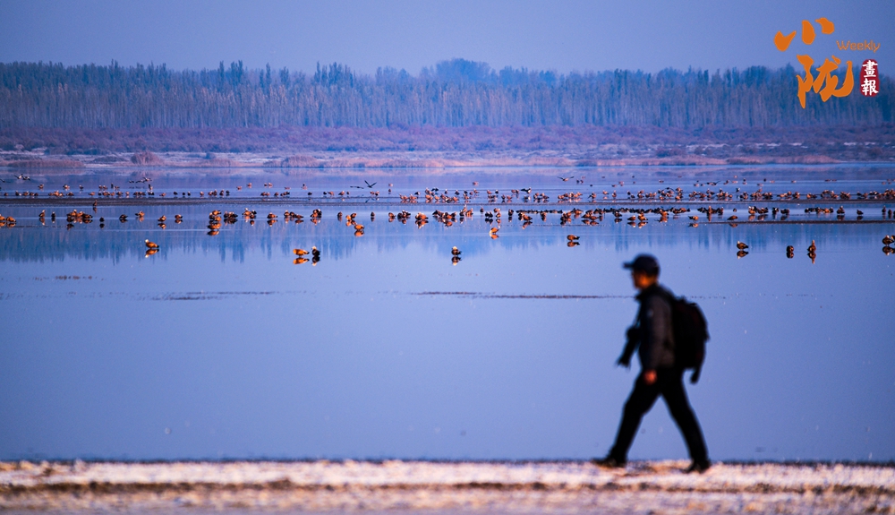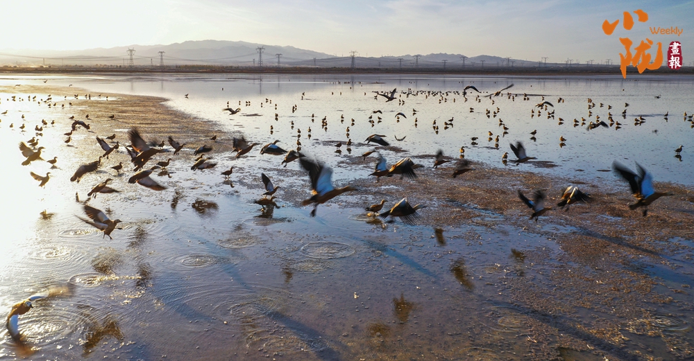陽光照射下,鹽沼像是一片白色的海洋,湖面波光粼粼。成千上萬只赤麻鴨,在這里停歇覓食,它們或在水中嬉戲打鬧,或在空中振翅飛翔,繪成了一幅秋日美景。