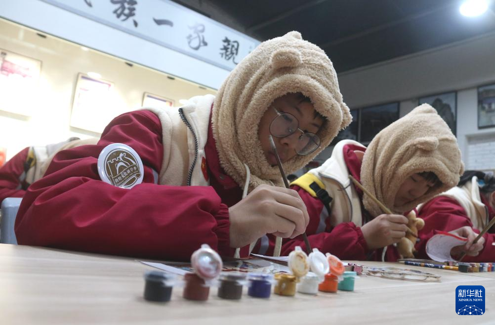 1月17日,在甘肅敦煌莫高里工匠村研學(xué)課堂,研學(xué)團隊學(xué)員學(xué)習(xí)臨摹敦煌壁畫。新華社發(fā)(張曉亮 攝)