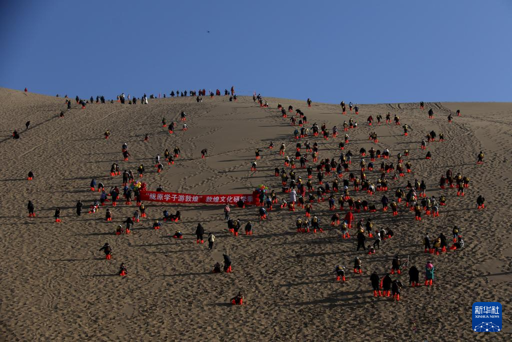 1月16日,研學(xué)團隊學(xué)員在甘肅省敦煌市鳴沙山月牙泉景區(qū)開展登山比賽。新華社發(fā)(張曉亮 攝)