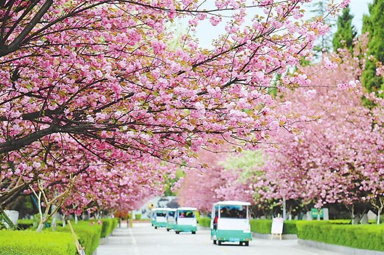 櫻花紅陌上,清香飄萬里——景區(qū)內(nèi)平坦?jié)崈舻陌倜讬鸦ù蟮郎?,一樹樹粉白的呈現(xiàn),宛若一望無際的雪白云朵,柔美的櫻花肆無忌憚地開在道路兩旁。