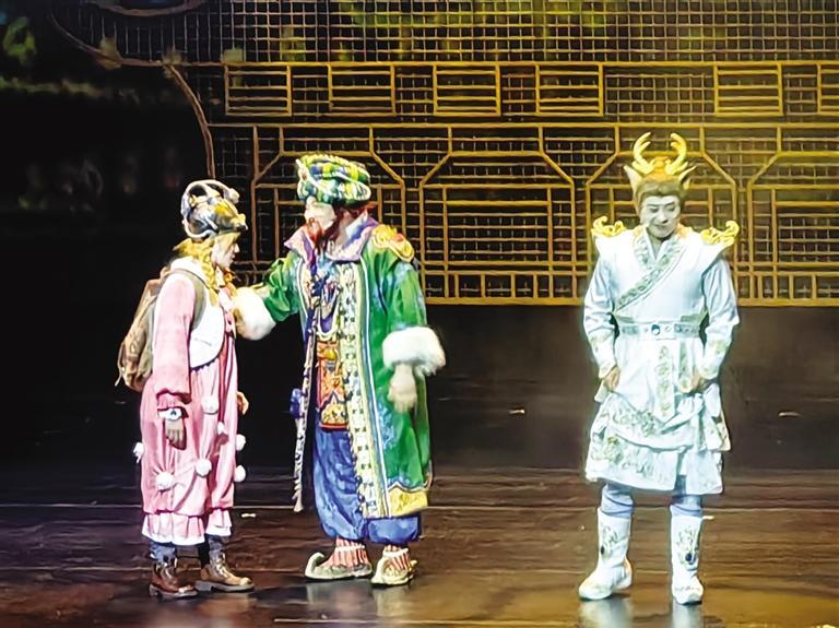 演出現(xiàn)場,大美敦煌被搬到舞臺上,星云變幻間,時空在劇場轉(zhuǎn)換,鹿鳴、莉娜、巴巴亞穿梭在沙漠、月牙泉和莫高窟、敦煌市集之間,與“先知”對話,向神仙請教,與沙塵暴斗爭,根據(jù)蛛絲馬跡尋找3件天宮樂器的下落。