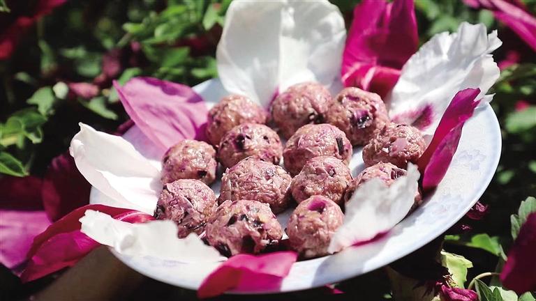 牡丹花肉丸,鮮香軟糯,做法不難。采摘新鮮的牡丹花,取花瓣用清水洗凈,選取肥瘦相間的羊肉剁成肉泥,和入切碎的牡丹花瓣,加入適量調(diào)料充分攪拌揉捏成丸子,裝盤入鍋蒸20分鐘左右即可。熱氣騰騰的牡丹花肉丸,花香伴著肉香,由不得人大快朵頤。