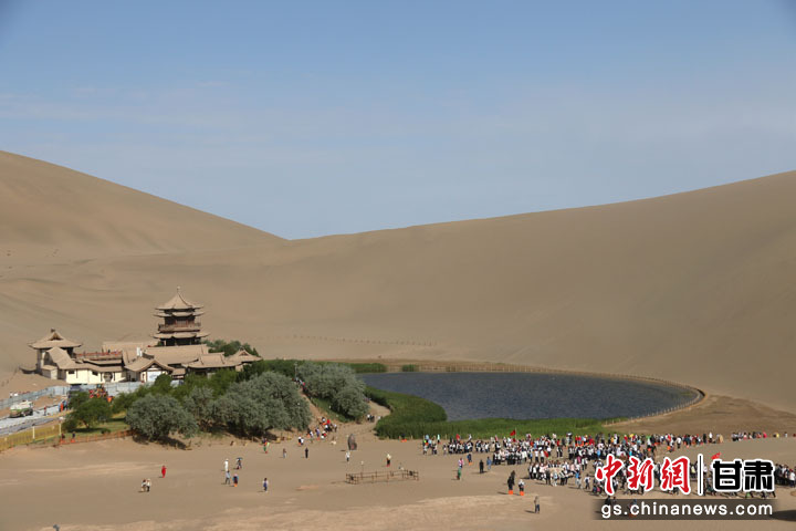 6月1日,游客在甘肅省敦煌市鳴沙山月牙泉景區(qū)游覽。張曉亮 攝