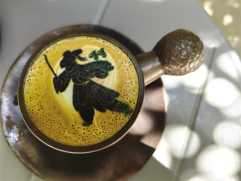 驚喜還有很多,就像店內柜體上的一句話“可以讓大家體會到我們不一樣的用心”,這些年輕人用心起來還真能撬動地球。飲品和咖啡,設計團隊愣是把口味和地域文化結合起來,整出了幾款“限量版”:城市限定——沙橙暴飲品,西北特有;特調咖啡——苦水玫瑰特調,讓人一口難忘之余還配上了臺詞,“苦水玫瑰有點甜”;“文物咖啡”更是占據“C位”,咖啡拉花機“印制”而成的微縮版銅奔馬、蛙紋罐、銅車馬等文物圖案浮在濃郁的咖啡上,精致、唯美。這還不算,咖啡器皿的名稱也非同尋常——鷹首權杖杯。陶瓷來自景德鎮(zhèn),手柄是省博鷹頭形青銅權杖首的文物原型。驚嘆、贊美、感慨,每一位品嘗之人喜愛之余竟不忍飲用。