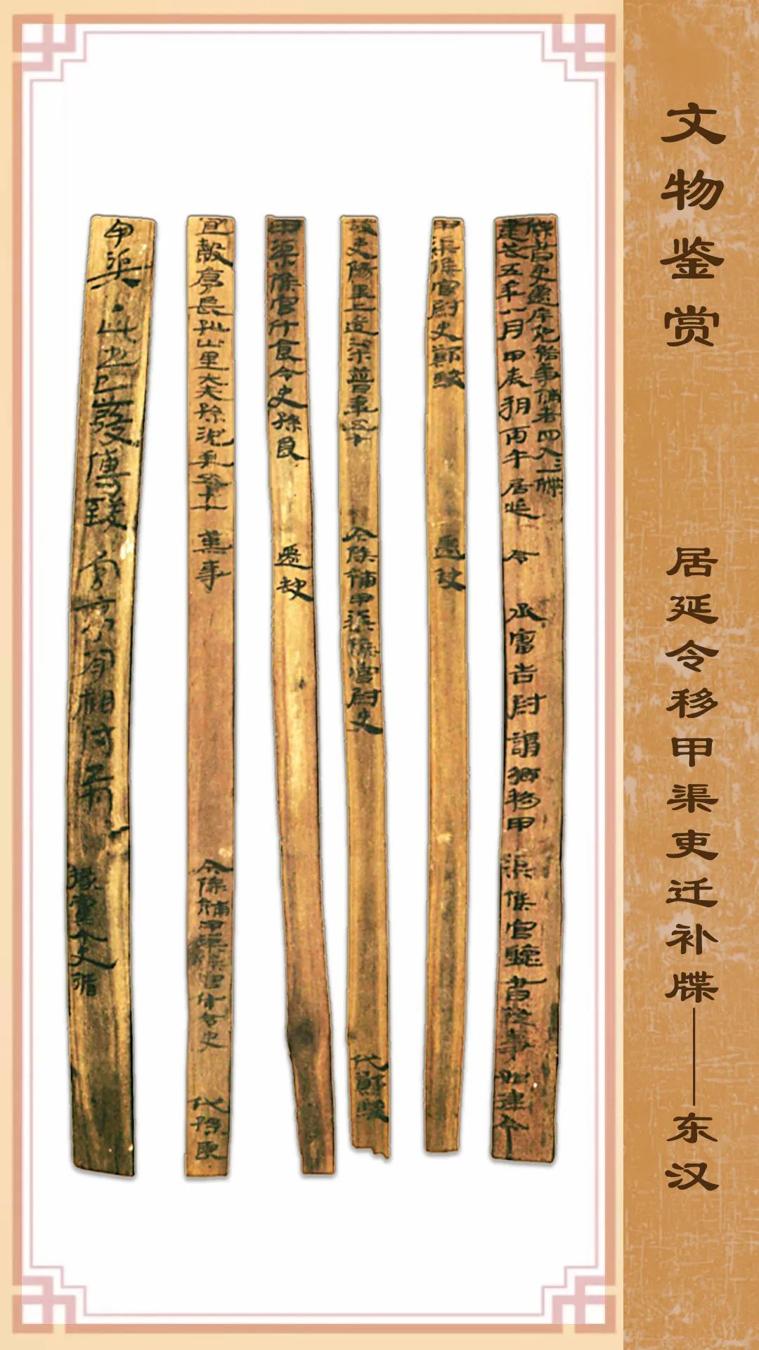 第一簡文字為:“牒書:吏遷、斥免、給事補者四人,人一牒。建武五年八月甲辰朔丙午,居延令 丞審告尉:謂鄉(xiāng)移甲渠候官,聽書從事,如律令。”這是文件的標題和行文要求。“居延令”之后尚留空白,說明這是一份還未正式生效的官員任免文件。其他4簡則是此次任免人員和崗位的具體內容。在簡牘背面書有此文件的起草人掾黨和令史循二人,屬于共同署名。該文書對了解漢代基層吏員的任免、除補等基本程式有重要參考價值?,F(xiàn)藏甘肅簡牘博物館。