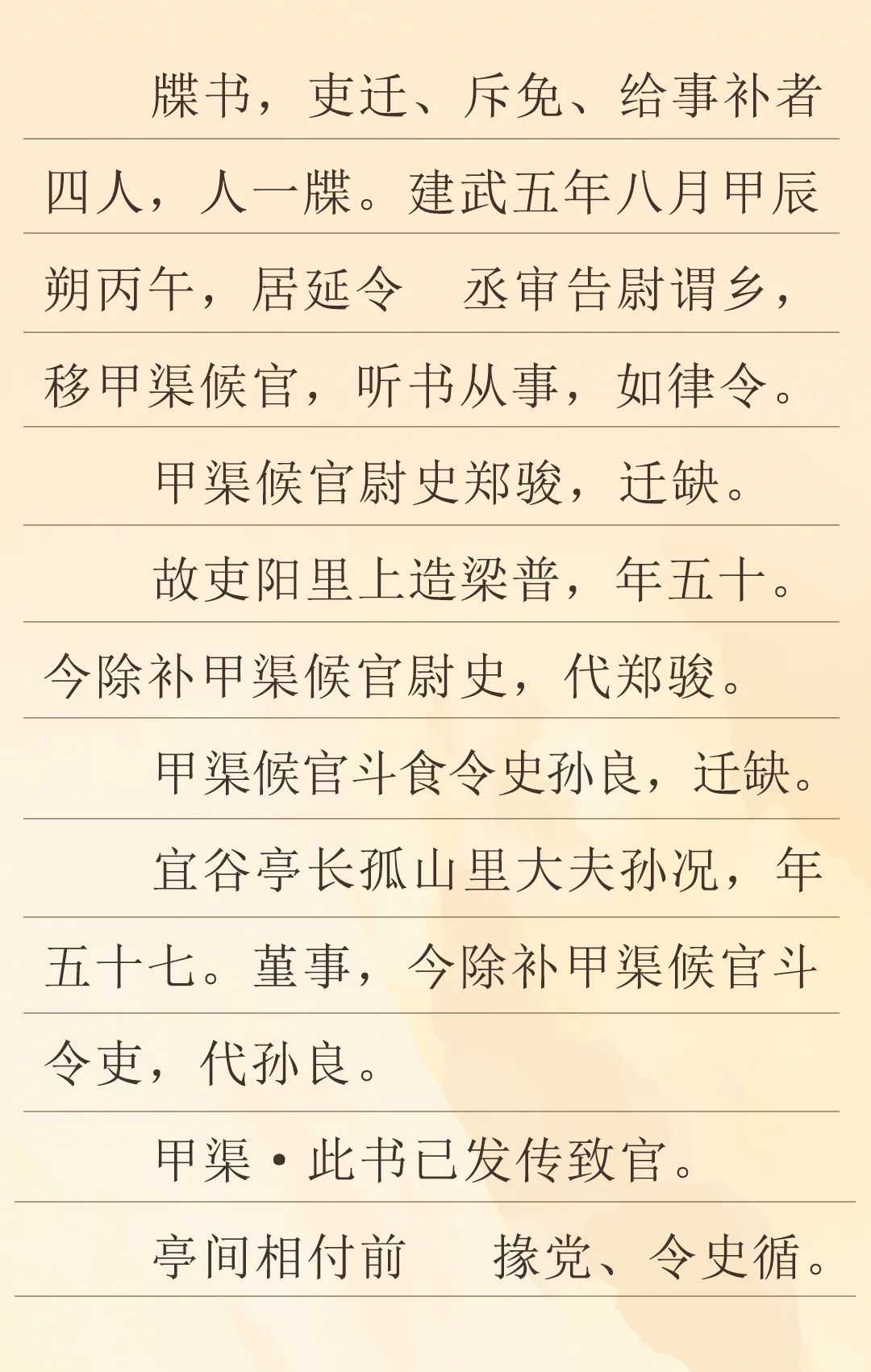這是一份距今1995年的地方官員任命書。當時是東漢建武五年八月,在漢代張掖郡居延邊塞的甲渠候官進行了人事調整,對官吏進行了任免。一個是甲渠候官尉史鄭駿升遷,由五十歲的梁普補缺;另一個是甲渠候官斗食令史孫良升遷,由五十七歲的原宜谷亭長孫況代任,其中提到孫況做人低調、行事嚴謹(即“謹事”)。這次人事調整是由居延縣負責。