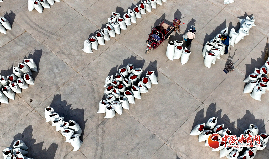 10月29日,張掖市臨澤縣新華鎮(zhèn)勝利村辣椒加工廠內(nèi),工人們正在為河南、山東的客商加工500噸紅辣椒干。