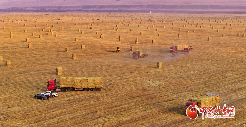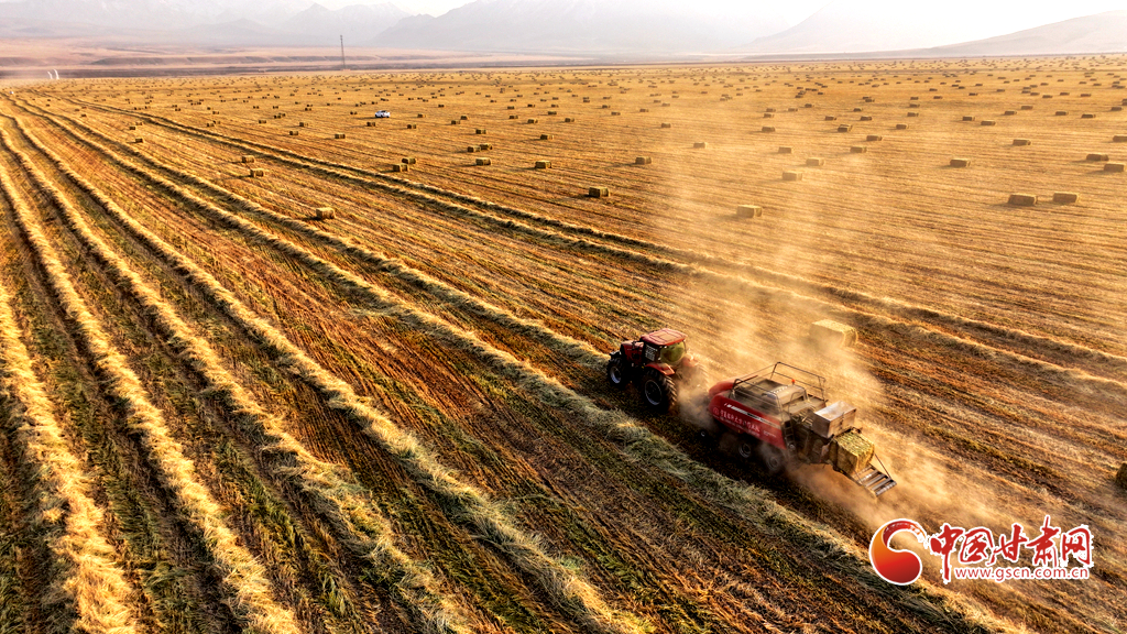 11月11日,甘肅山丹馬場(chǎng)的10萬(wàn)畝燕麥草進(jìn)入打包高峰期,田野上呈現(xiàn)出一派繁忙而有序的景象。放眼田間,大型農(nóng)用機(jī)械來回穿梭,將燕麥草迅速壓縮、打包,一個(gè)個(gè)草捆整齊排列。與此同時(shí),滿載草捆的運(yùn)輸車在田間小道上來回奔波,將成品送往倉(cāng)庫(kù)和銷售地。