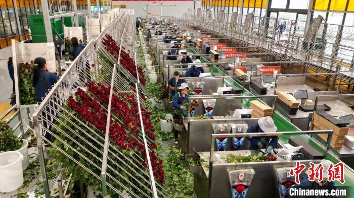 目前,當?shù)亟ǔ擅娣e20萬平方米高新智能化溫室,鮮花四季盛開。記者看到,棚頂紅色的全自動補光燈正在為玫瑰“延長光照時長”。精準控制營養(yǎng)液成分和濃度的智能化水肥一體化系統(tǒng)、自動化分選等高新設備投入,科技種植和品質上升,讓臨夏成為中國重要的優(yōu)質鮮切花生產基地,日產20萬枝鮮切花,海內外訂單不斷。