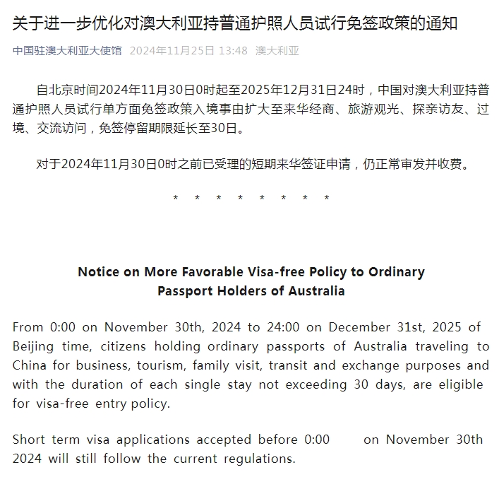 據(jù)“中國駐澳大利亞大使館”微信公眾號消息,自北京時間2024年11月30日0時起至2025年12月31日24時,中國對澳大利亞持普通護(hù)照人員試行單方面免簽政策入境事由擴(kuò)大至來華經(jīng)商、旅游觀光、探親訪友、過境、交流訪問,免簽停留期限延長至30日。