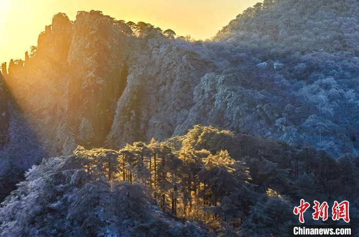 11月26日,黃山風(fēng)景區(qū)雪后初霽,朝陽(yáng)照射在山峰上。張寧 攝