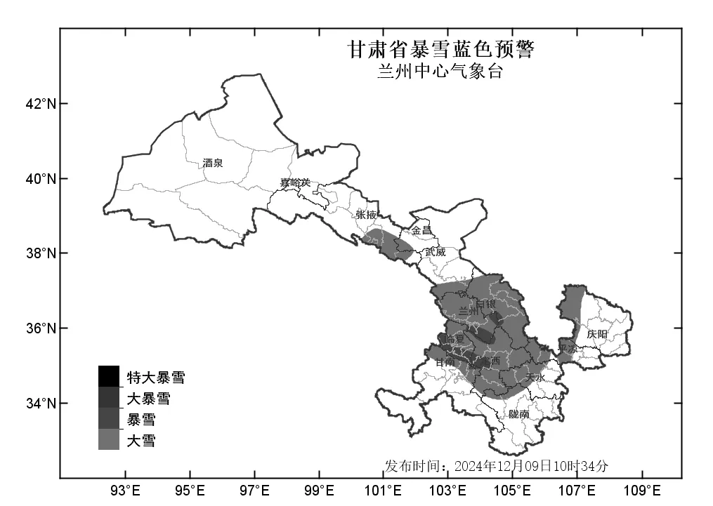 中國甘肅網(wǎng)12月9日訊(西北角·中國甘肅網(wǎng)記者 沈文剛)12月9日10時34分,蘭州中心氣象臺發(fā)布暴雪藍色預警,預計9日15時至10日20時,蘭州、白銀、定西、臨夏等市州及甘南北部、天水西部、平?jīng)鑫鞑?、慶陽西部、張掖南部、武威南部將出現(xiàn)大雪;臨夏南部、定西西部、蘭州南部、白銀中部將出現(xiàn)暴雪。