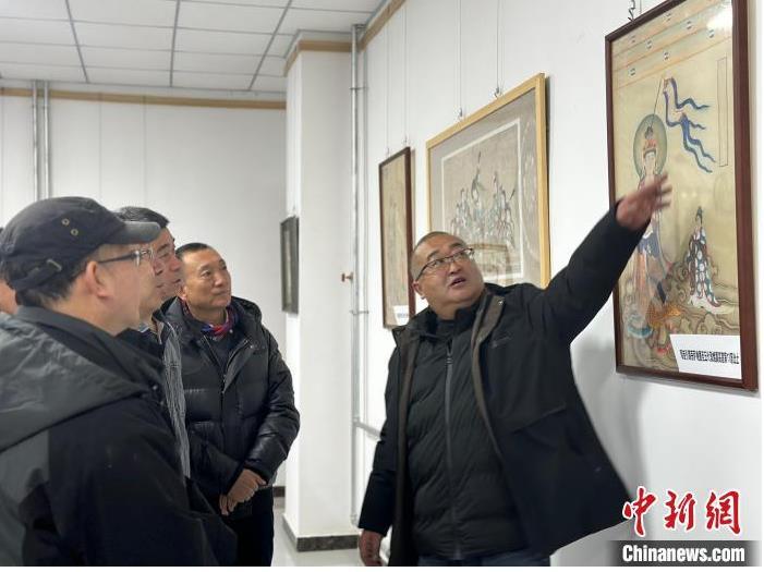 12月17日,由蘭州市七里河區(qū)委宣傳部、七里河區(qū)文體旅局聯(lián)合舉辦的“大漠孤陽(yáng)映彩霞 敦煌神韻美如畫”新時(shí)代文明實(shí)踐主題活動(dòng)暨敦煌巖彩畫書畫藝術(shù)展拉開帷幕。圖為展覽組織者為參觀者講解展出的作品。楊娜 攝