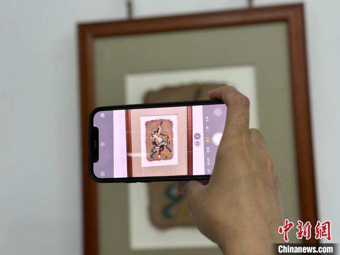 12月17日,由蘭州市七里河區(qū)委宣傳部、七里河區(qū)文體旅局聯(lián)合舉辦的“大漠孤陽(yáng)映彩霞 敦煌神韻美如畫”新時(shí)代文明實(shí)踐主題活動(dòng)暨敦煌巖彩畫書畫藝術(shù)展拉開帷幕。圖為參觀者拍攝展出的“反彈琵琶”題材巖彩畫。楊娜 攝