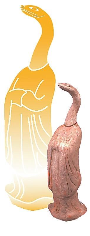 伏羲和女媧是中國神話傳說中的創(chuàng)世神靈,被視為人類文明的始祖。相傳他們均為蛇身人首的形象,象征著自然與人類的和諧統(tǒng)一。伏羲被認為是發(fā)明八卦、結繩記事的智者,開啟了中華文明的智慧之門;而女媧則以其神力摶土造人,煉石補天,維護了天地的秩序。展覽中展出的高臺縣博物館館藏的一件魏晉時期的女媧圖彩繪壁畫磚。畫面繪女媧,人首蛇身,獸足,頭梳高髻,著交領紅裳,右手持月輪,月輪內有蟾蜍,左手持規(guī),周圍繪云氣。同時,還展出了一件高臺縣博物館館藏魏晉時期的伏羲女媧畫像磚,左側女媧,一手持矩、一手拿陰物,人首、蛇身、獸足、挽高髻、著交領長衣,腹部繪月輪;右側伏羲,右手持規(guī),左手持日,內有一金烏,周圍云氣環(huán)生,意在天界暢游。兩磚拼合形成陰陽交合圖,為墓葬中室頂部藻井彩繪圖像。畫像中人首蛇身的伏羲、女媧形象,濃縮著中國上古時代的蛇崇拜意識。我國古代有天圓地方之稱,伏羲執(zhí)規(guī)象征天,女媧執(zhí)矩象征地,反映了墓主人追隨升天的愿望,也期望其后代能夠繁衍生息。