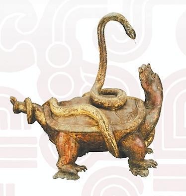 玄武是“四神”中的北方之神?!洞蟠鞫Y》:“龜上彎象天,下平法地。千載神龜,問無不知,廣育無雄,以蛇為雄。故龜與蛇合謂玄武”。因此龜蛇形象的組合亦有陰陽交接之意。除了瓦當、畫像磚、雕塑外,古人還常將此二物繪于旗上,用于指揮軍隊、消災避害之用。