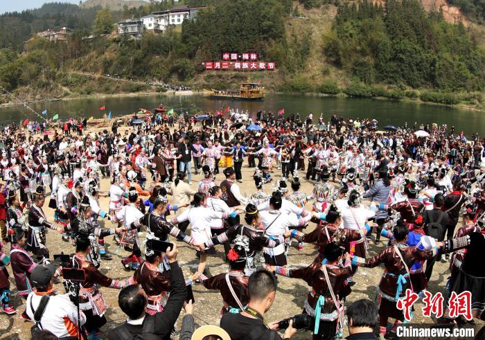 2024年3月11日,在廣西三江侗族自治縣梅林鄉(xiāng),“二月二”侗族大歌節(jié)活動(dòng)吸引游客前來體驗(yàn)侗鄉(xiāng)風(fēng)情。圖為民眾在跳多耶舞?! 蔷殑?nbsp;攝