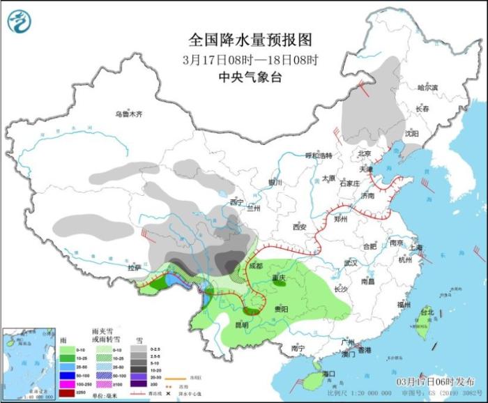 預計3月17日至23日,西藏東部、青海南部、川西高原、云南北部等地有小到中雪或雨夾雪,局地有大到暴雪;西藏東南部、四川盆地、貴州、云南中南部等地有小到中雨,局地有大雨。