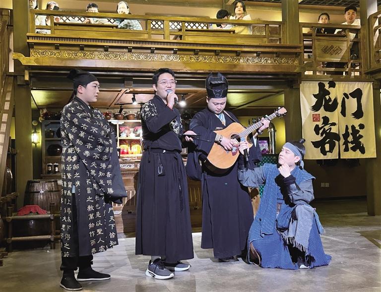 “諸位小友近來(lái)可好?”“好!”在街區(qū),NPC們與游客的互動(dòng)成為一大亮點(diǎn)。為了讓游客更好地沉浸其中,街區(qū)里的“蘭裳閣”專(zhuān)門(mén)提供服裝出租和妝造設(shè)計(jì)服務(wù)。游客們?cè)谶@里換上漢服、做好造型,“穿越”成古人與NPC們共同沉浸在這場(chǎng)歷史旅行中。張偉彥在“龍門(mén)客棧”工作快半年了,飾演店小二馬一刀。他對(duì)角色有著自己的理解:“導(dǎo)演讓我演店小二,大家印象里店小二都是機(jī)靈、腿腳快的。但我演的這個(gè)店小二帶著江湖氣息,他藏在龍門(mén)客棧,其實(shí)是個(gè)刀客,在這里打工是為了打探消息,畢竟龍門(mén)客??墒墙⒌木奂?。”記者走在街區(qū),時(shí)不時(shí)就能看到他拿著草帽,熱情地招呼游客玩接帽子游戲。遇到靦腆不敢嘗試的游客,他也會(huì)不斷鼓勵(lì),有時(shí)候碰上外國(guó)游客,他還隨口說(shuō)幾句英語(yǔ)與其互動(dòng)。