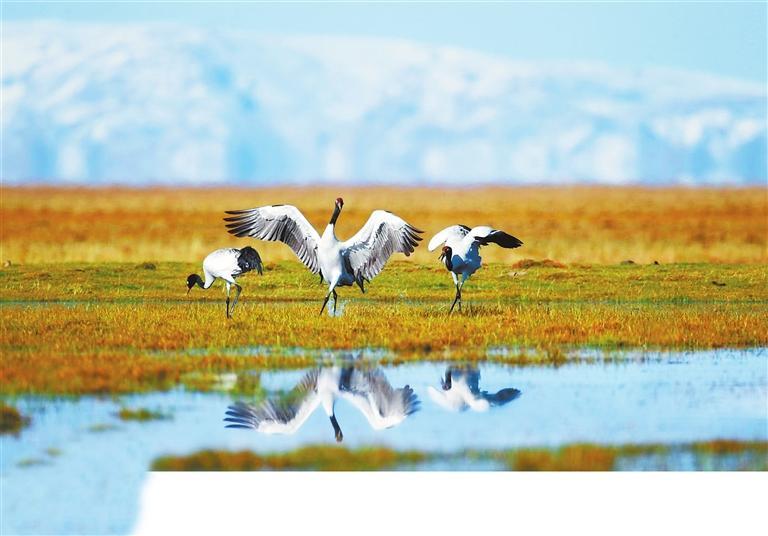 尕海湖的晨霧尚未散盡,黑頸鶴的赤紅色頭頂已經(jīng)開始閃現(xiàn)。它們在苔草間跳起求偶之舞,頭頂?shù)闹旒t隨舞步明滅,如同螢火蟲的閃光。新孵化的雛鶴,棕黃色絨羽間染著乳白,是大地贈予新生命的第一抹色彩。這種國家一級保護(hù)動物蹣跚學(xué)步時,總被親鳥用長喙輕推,這場景會令保護(hù)區(qū)巡護(hù)員想起女兒初學(xué)自行車時自己的緊張。
