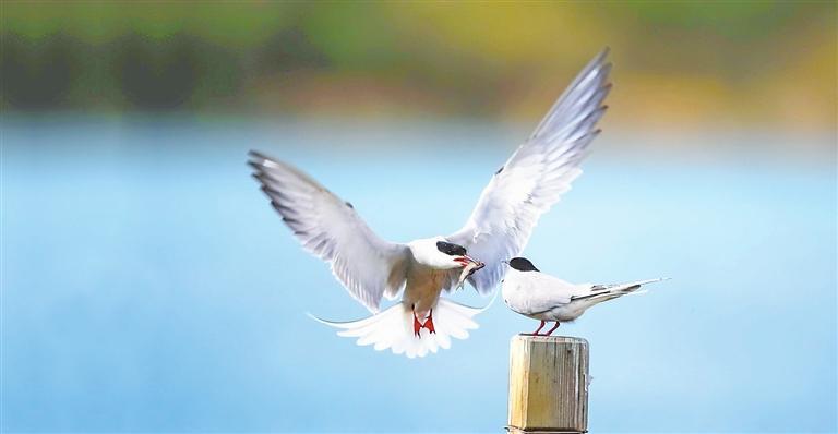 同屬鷗類大家族,漁鷗的體型要比普通燕鷗大得多。換上了黑色頭羽的繁殖期成體,張開那約一米半的雙翅,頗顯幾分霸氣。可它竟強(qiáng)盜成性,選擇劫掠其他水鳥。盜獵時翼尖滴水,以橘紅色喙尖刺中燕鷗的魚獲。一瞬間,生存競爭的殘酷與生命的頑強(qiáng)在這一刻達(dá)成了奇妙的平衡。