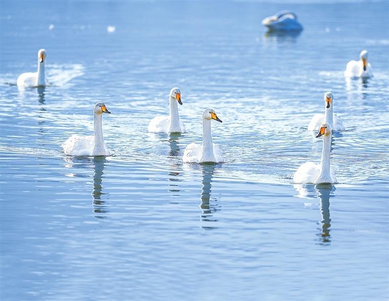 蘭州三江口濕地的冰封河畔上,大天鵝用喙基布滿冰霜的橙喙鑿開生存通道。這里是目前野生天鵝在蘭州的唯一越冬所,為冬日黃河增添了一份靈動和生機(jī)。這些北方來客的羽毛并非純白,頸部沾染鹽霜草漬后形成獨(dú)特的顏色與紋路,像是歲月在它們身上留下的印記。當(dāng)?shù)亟M織了巡護(hù),并有專人定期投飼。